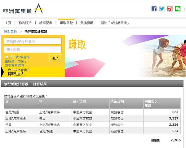 圖片擷取自亞洲萬里通網站 飛行里數計算器