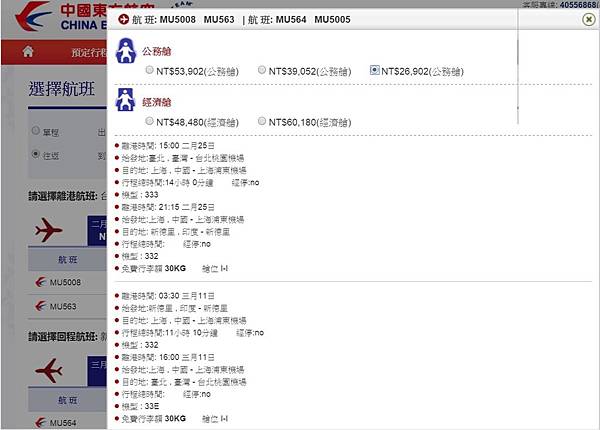 圖片擷取自中國東方航空官方網站 台北--德里 機票選擇